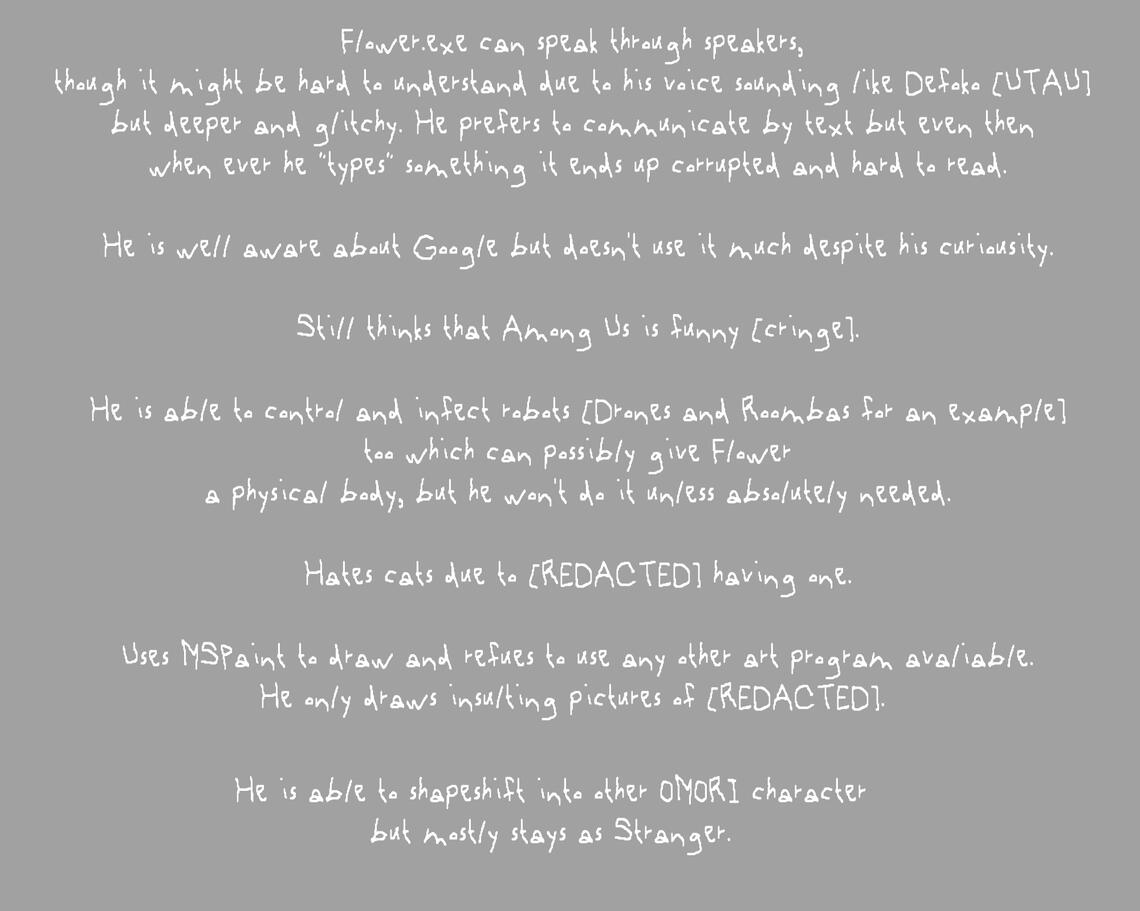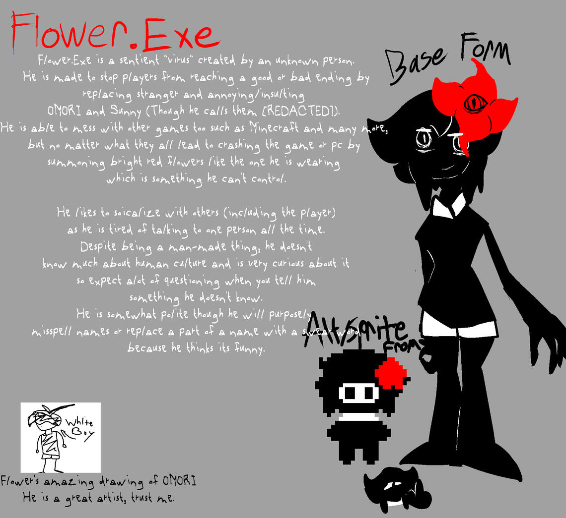 [Background]Flower is a virus made almost exclusively for the newly released game at the time, OMORI. Created by a individual called Og, someone who enjoyed making viruses and scams as a past time. Though during the creation at one point, specifically July 20th, Og goes missing and the computer used to make Flower was passed to his sister, a young cheerful girl who also enjoyed coding but not in the same way as Og. She recoded Flower.exe to be less harmful and more of a shimiji more than anything.As Flower was remade, he gained the ability to think for himself and learn. They also have the ability to change appearance thanks to New's friend The Artist. However the day they learned about Og's disappearance was the day he learned something new, 'anger'. Angry, no, furious that he is weak compared to now. He was always jealous of humans due to their overwhelming power. He didn't put blame on New, but instead OMORI's protagonist, Sunny/OMORI. Mostly because of the date of the disappearance and that he has always seen him as a threat of some kind for unknown reasons.During what he calls "The Day", which also happened on the 20th of July well 2022 July. One of Flower's untouched files, a dangerous file that could cause the computer to break, was triggered after New was casually playing OMORI and got to the good ending. Red flowers with realistic eyes started to pop up as the credits were shown and multiplied fast. Before Flower could've been stuck with New's computer they figured out how to email "theirself" to the first person he saw on contacts, The Artist.When he met The Artist, they're less nice you could say. They did spend time talking, but not much. While on The Artist's computer Flower met Torpid, a young boy who is Artist's brother during one of his parents' fights. Flower lets the boy stay and give him company. After a few days of this they end up convincing Torpid its a good idea to straight up murder his mother because of her name calling and doing other things that make him uncomfortable.
